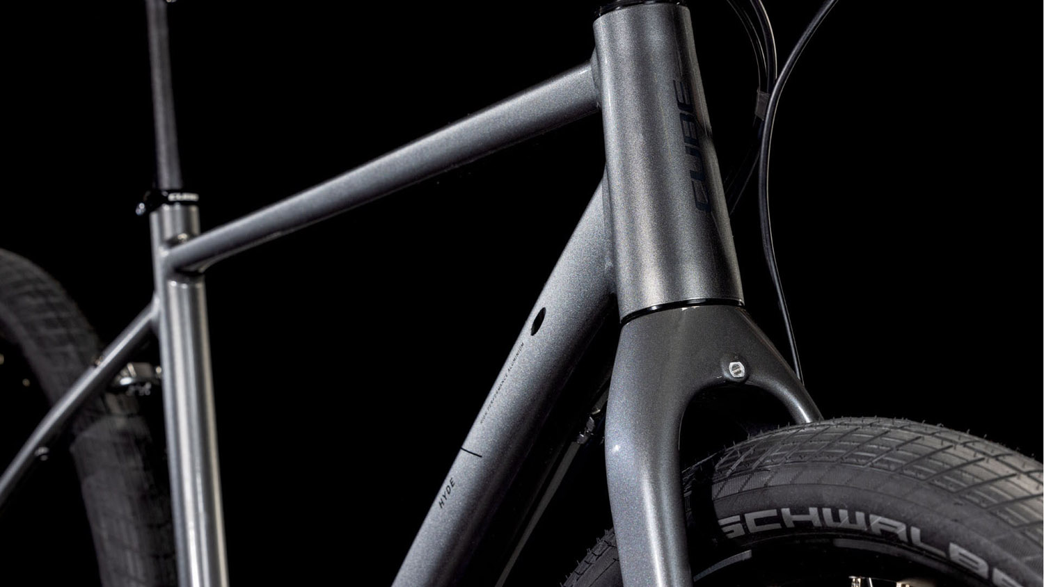 Der schlanke und robuste Rahmen des Hyde erinnert stark an den der Cube 29-Zoll-Mountainbikes und fühlt sich vor allem im Großstadtdschungel zu Hause. Rohrsätze aus doppelt konifiziertem Aluminium geben ihm eine stabile und zugleich leichte und agile Struktur. Ein überaus formschön ins Design integrierter Gepäckträger und Aufnahmepunkte für Schutzbleche sorgen für die nötige Vielseitigkeit und Flexibilität. Außerdem bietet das Chassis genügend Platz für die Montage eines zweiten Flaschenhalters, falls die Tour am Wochenende doch mal wieder länger dauert als geplant. Eine leichte Vollcarbongabel vollendet das Set-up – für höchste Lenkpräzision und einen eleganten Look.