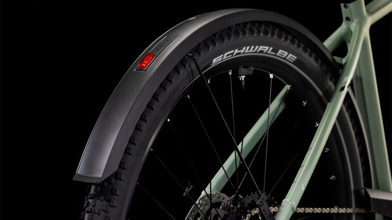 Wenn CUBE etwas kann, dann elegante Rahmen mit 1a-Handling bauen – doch bei der Entwicklung des Nuride Hybrid haben sie sich in Sachen funktioneller Ästhetik selbst übertroffen. Neben einer Federgabel mit 100 mm Federweg für ein Plus an Fahrkomfort und Kontrolle haben sie das Chassis mit großzügiger Reifenfreiheit (sogar inklusive der mitgelieferten Schutzbleche) ausgestattet. Im Inneren verlaufende Züge unterstreichen die cleane Optik des Rahmens und verursachen kaum Wartungsaufwand. Ebenso harmonisch ins Design integriert sind der Bosch CX Antrieb und der starke PowerTube Akku. Außerdem gibt’s einen Kettenschutz sowie ein UDH für einfachere Ersatzteilverfügbarkeit. Was noch? Serienmäßig verbaute Schutzbleche, Lichter und ein Seitenständer. Da kann das nächste Touren-Abenteuer kommen!