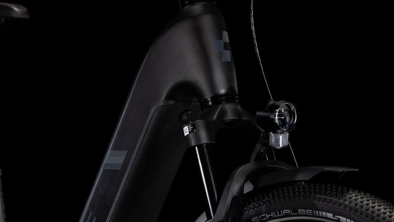 Der Tiefeinsteiger-Rahmen des Nuride Hybrid hält, was sein Name verspricht – einfaches, unkompliziertes Auf- und Absteigen sind damit garantiert. Doch da ist noch mehr: Neben einer Federgabel mit 100 mm Federweg für ein Plus an Fahrkomfort und Kontrolle hat CUBE das Chassis mit großzügiger Reifenfreiheit (sogar inklusive der mitgelieferten Schutzbleche) ausgestattet. Im Inneren verlaufende Züge unterstreichen die cleane Optik des Rahmens und verursachen kaum Wartungsaufwand. Ebenso harmonisch ins Design integriert sind der Bosch CX Antrieb und der starke PowerTube Akku. Außerdem gibt’s einen Kettenschutz sowie ein UDH für einfachere Ersatzteilverfügbarkeit. Was noch? Serienmäßig verbaute Schutzbleche, Lichter und ein Seitenständer. Da kann das nächste Touren-Abenteuer kommen!