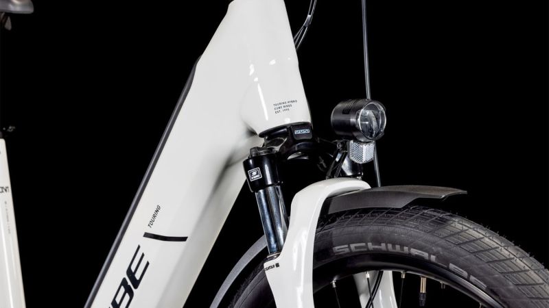 Dezenter Look, unkompliziertes Handling – der Tiefeinsteigerrahmen des Touring Hybrid ist wahrlich eine Klasse für sich, hier folgt die Form der Funktion. Im Zentrum dabei: der Bosch Performance Motor mit 625 Wh PowerTube Akku, den CUBE so ästhetisch ins Design integriert hat, dass er kaum auffällt. Außerdem macht die Efficient Comfort Geometry ihrem Namen alle Ehre und fährt sich bei sämtlichen Ausfahrten durchwegs bequem und angenehm. Noch mehr Komfort – und ein kontrolliertes Fahrgefühl auf holprigen Strecken – verspricht die Federgabel mit ihren 63 mm Federweg. Selbstverständlich hat CUBE auch an die so wichtigen Zubehördetails gedacht und einen semi-integrierten Gepäckträger, Schutzbleche, Lichter und einen Seitenständer montiert. Da kann das Zweiradabenteuer doch direkt losgehen, oder?