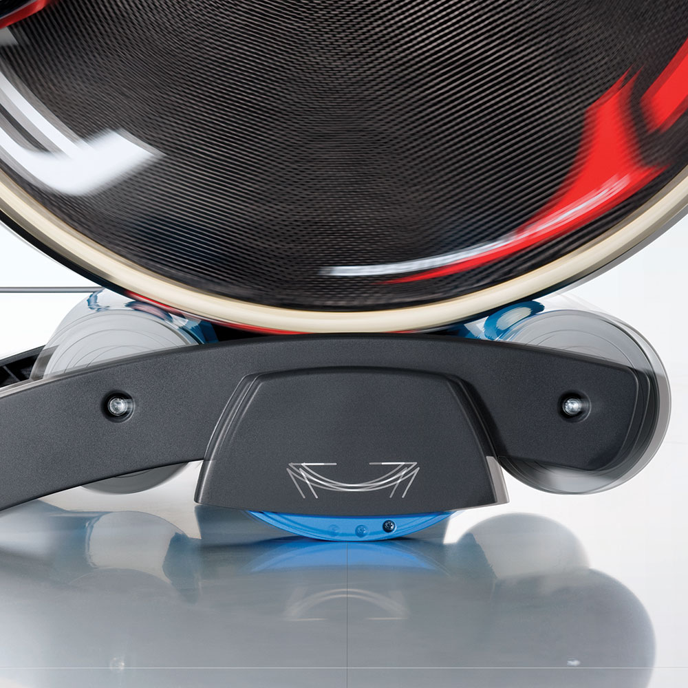 Das Schwingsystem des Galaxias stellt sicher, das der Rollentrainer vorwärts und rückwärts schwingen kann. Wenn du sprintest, dein Tempo schnell änderst oder auf den Pedalen stehst, fängt das System die schnelle Vorwärts- oder Rückwärtsbewegung auf, sodass du nicht vom Trainer fährst.