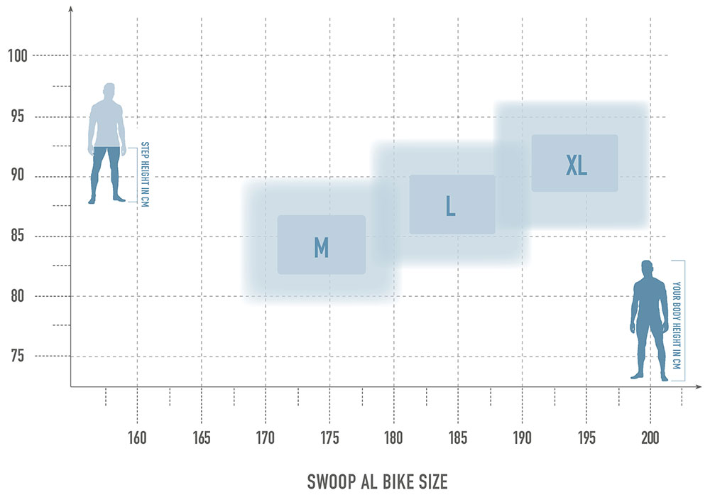 Mit Hilfe unserer Grafik wollen wir Dir eine Empfehlung bei der Suche nach Deiner richtigen Rahmengröße geben. Neben Schrittlänge sowie Körpergröße spielt natürlich auch Dein persönlicher Fahrstil, Einsatzbereich sowie Vorliebe eine große Rolle. Wenn Du mit Deinen Angaben im Grenzbereich liegen solltest, kannst Du zwischen zwei Rahmenhöhen wählen: die kleinere Rahmengröße ist agiler/wendiger/verspielter, die nächstgrößere Rahmenhöhe laufruhiger/spurtreuer.