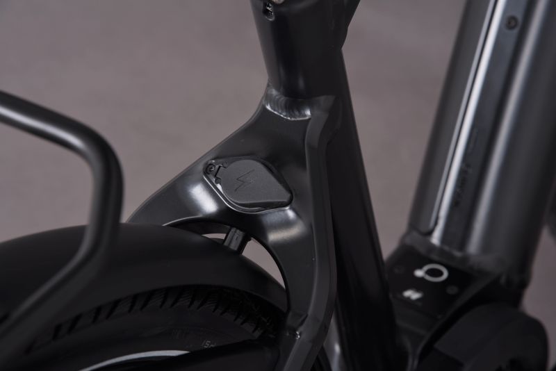 Der Akku lässt sich dank der im Rahmen integrierten Abdeckung einfach und ohne Aufwand entnehmen. Beim Transport ohne Akku bleiben Rahmen und Fach zuverlässig vor Witterungseinflüssen geschützt. Alternativ kann der Akku direkt am E-Bike geladen werden – die gut erreichbare Ladebuchse am Hinterbau und der praktische Magnetstecker sorgen für besonders einfaches und ergonomisches Handling.